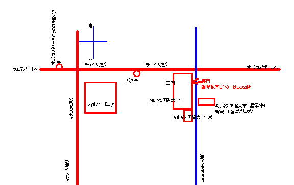 キルギス国際大学地図 オッシュバザールから38番のバスに乗り フィルハーモニアのバス停で下車。バス停は 道路の反対側になっているので いったん地下通路で 反対側に出てください。キルギス国際大学まで歩いて7分です。裏門に回り 2階にお越しください。 付近の人に (学校責任者)『アクルベコバ』と聞けばわかります。 アクルベコバ学校責任者は 英語があまりできないので 付近の英語ができる人を介しての 会話になります。 学校責任者 アクルベコバはここをクリック 戻る
