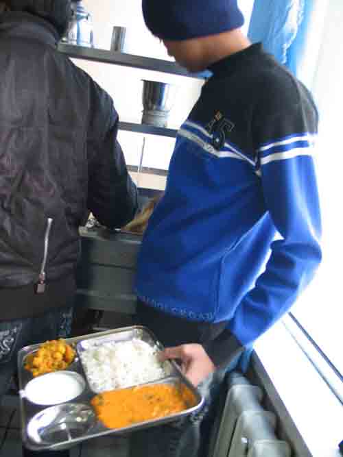 下の写真 学寮の食堂 2010年撮影 食事は インドパキスタン系食事です。箸は持参してください。インドパキスタン系の学生は 手づかみで食事をします。セルフサービスになっているので 自由に おかわりできます。1ヶ月3食 100ドルです。土曜日曜も給食はあります。このほかに(学寮食堂のほかに 一般の食堂が 大学本館の1階にあります)