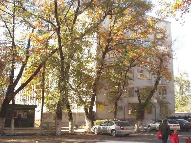 下の写真 キルギス国際大学 語学棟 キルギス国際大学本館とは 道路を挟んで 反対側に建てられています。この1階はクリニックになっています。背中合わせにホステル2(新寮)となっています。